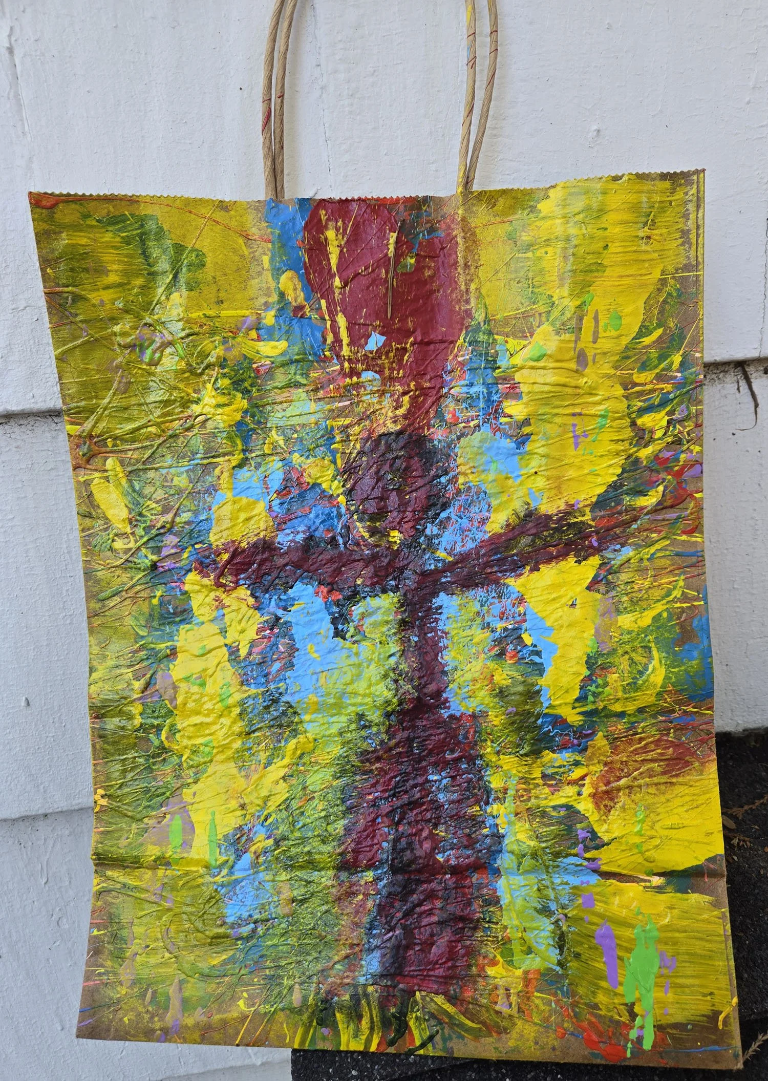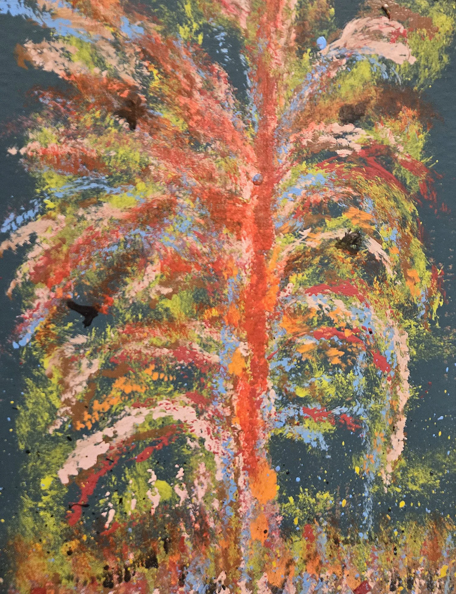 My materials are simple, and cardboard is my foundational canvas. Household painting gives me plenty of choices, and my brushes are mainly tree branches and my own hands.